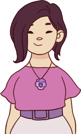 Flora has a fair skin tone with dark-colored hair. She wears a pink blouse with butterfly sleeves, purple belt, and a white skirt. Her necklace has a purple pendant of her favorite flower, the pansy.